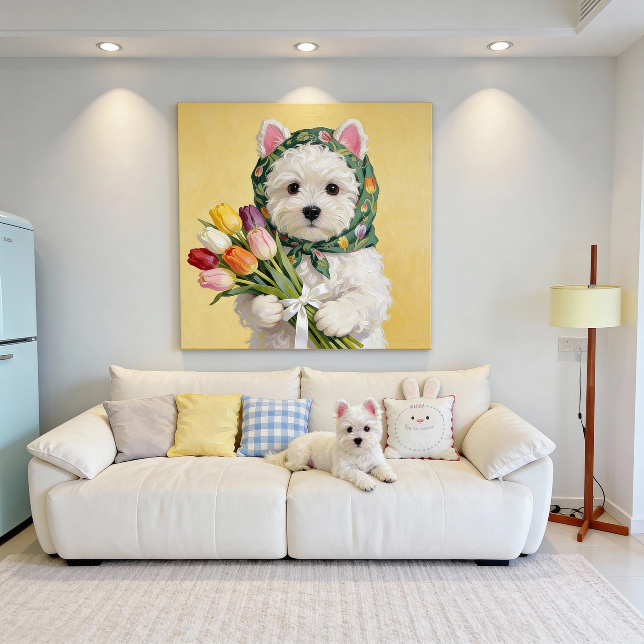 A sunshine-bright portrait with serious bouquet energy. This custom canvas transforms your pet’s real photo into a warm, oil-painting-style artwork—featuring a green tulip-print headscarf and a hand-tied bouquet of colorful tulips on a golden background. It’s classic-meets-cute: soft brush textures, rich color, and a playful concept that instantly makes your space feel styled.