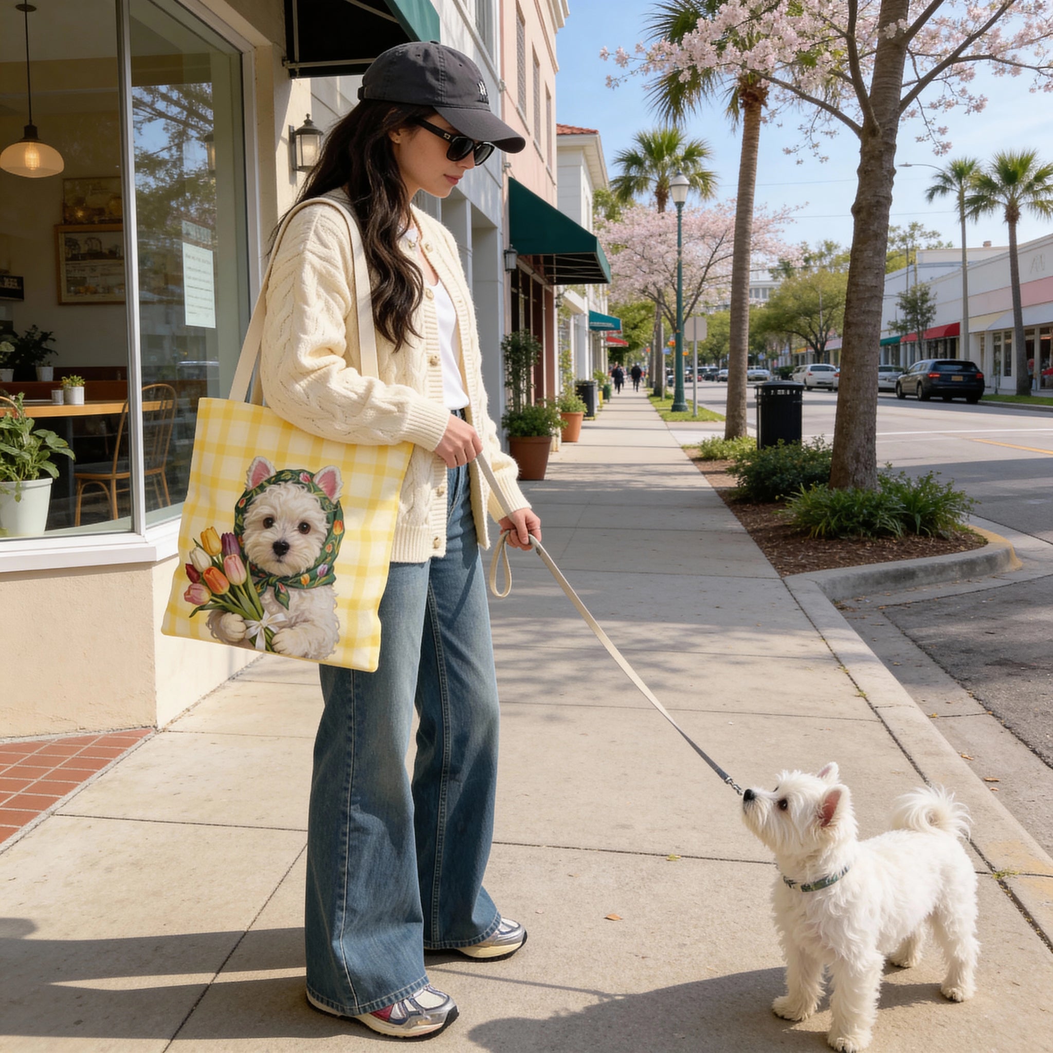 Carry a little sunshine. This custom pet tote bag turns your pet’s photo into a soft, painterly portrait—complete with a tulip bouquet—set against a warm yellow gingham background for a clean, premium, feel-good look. Cute enough for compliments, minimal enough for everyday.